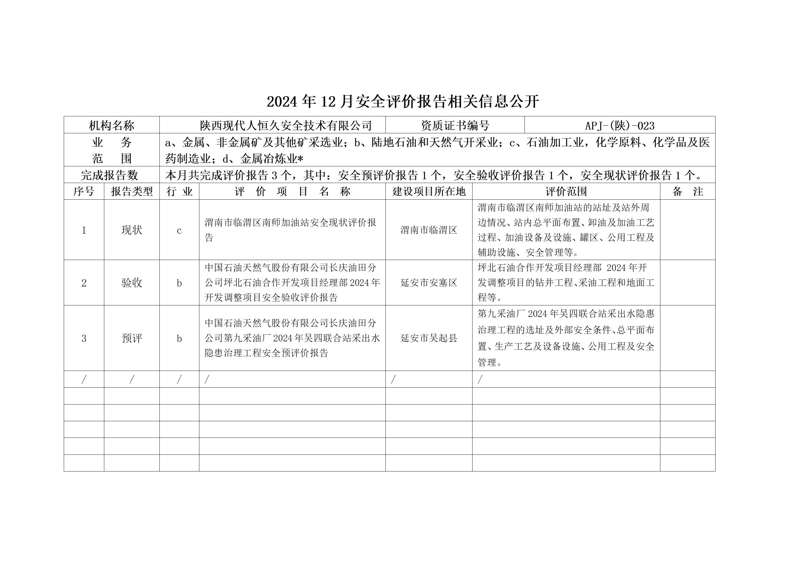 2024年12月安全评价报告相关信息公开