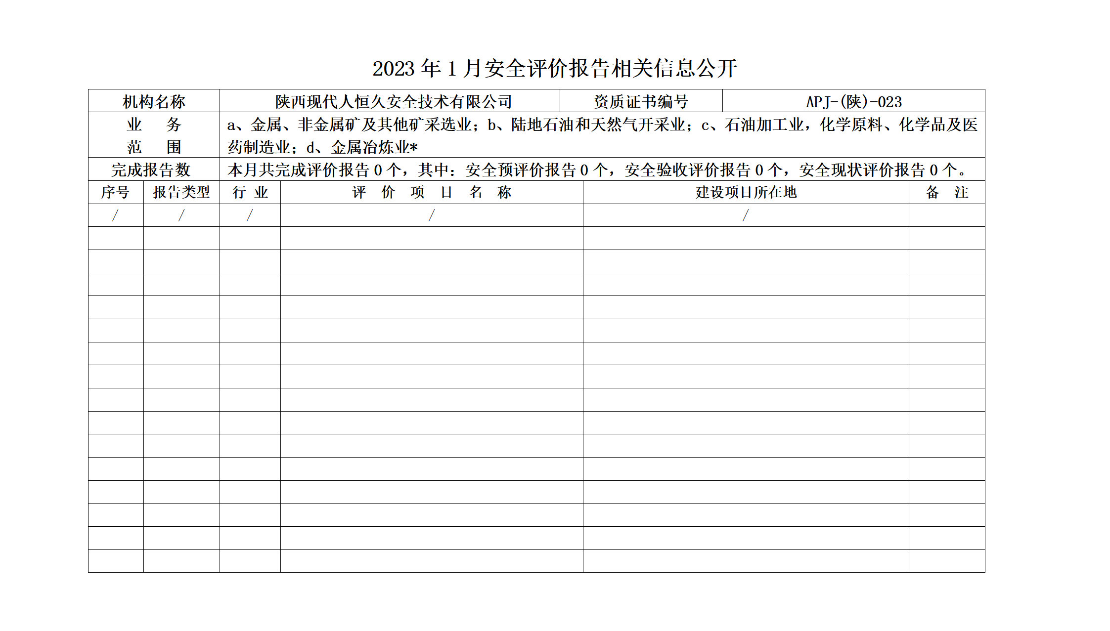 2023年1月安全评价报告相关信息公开